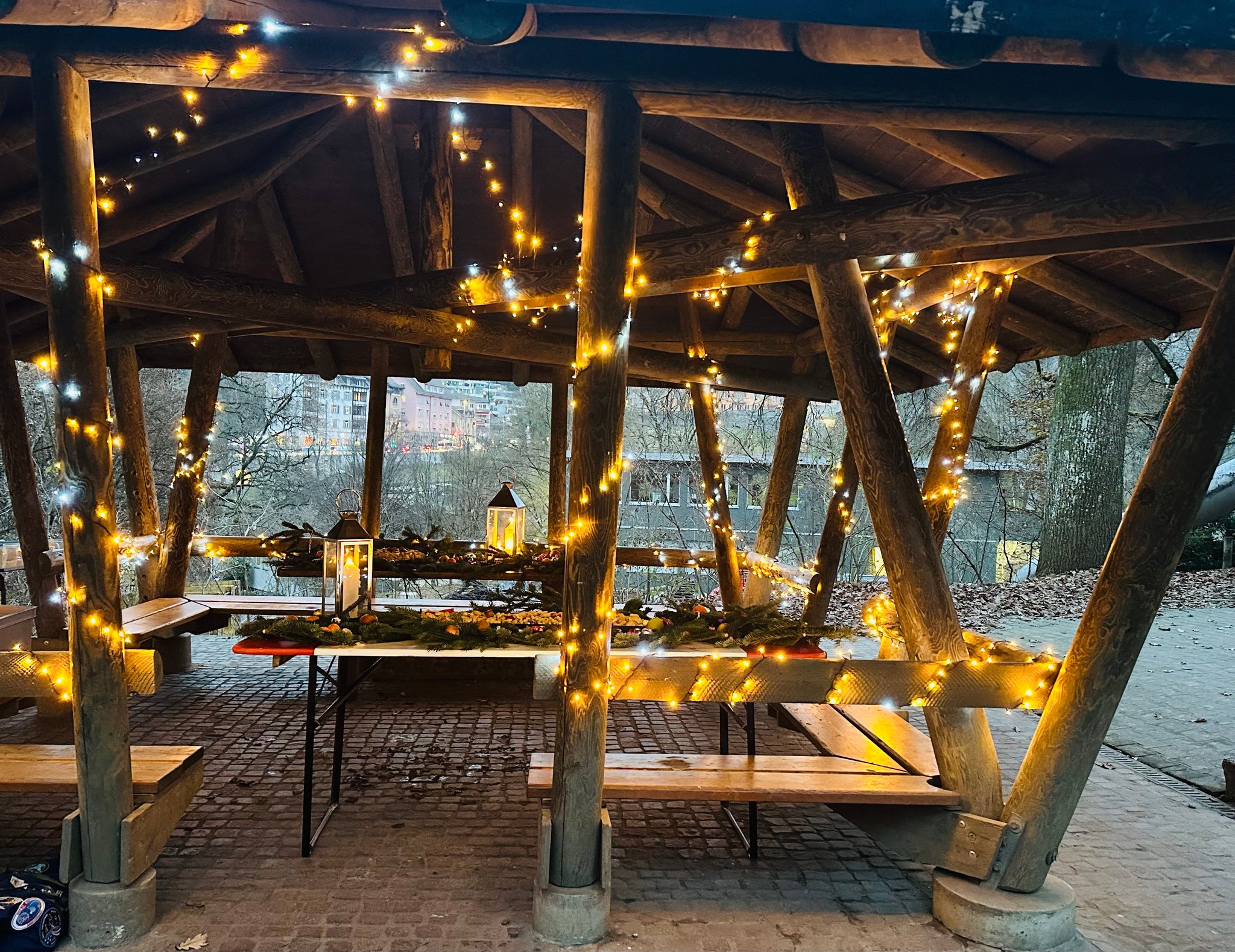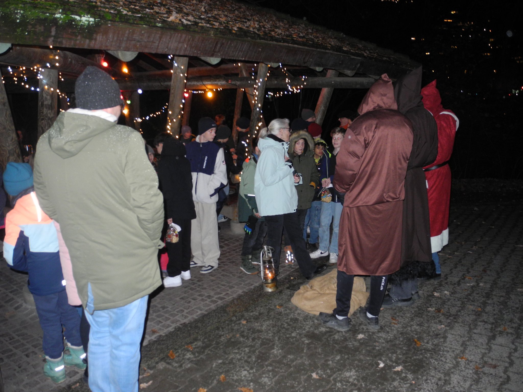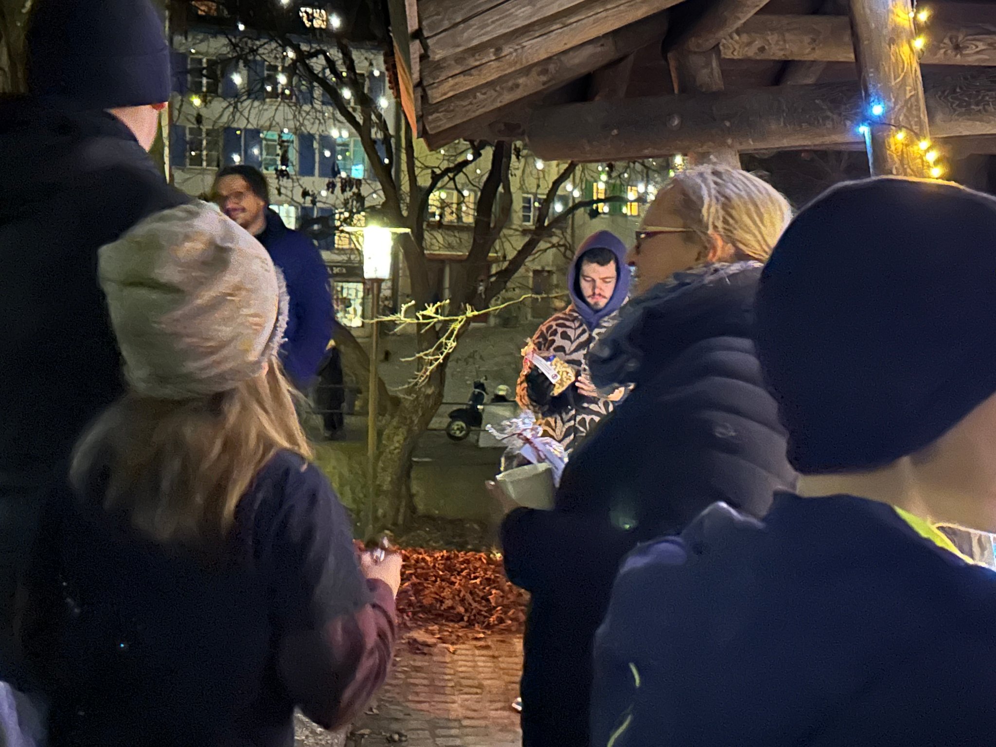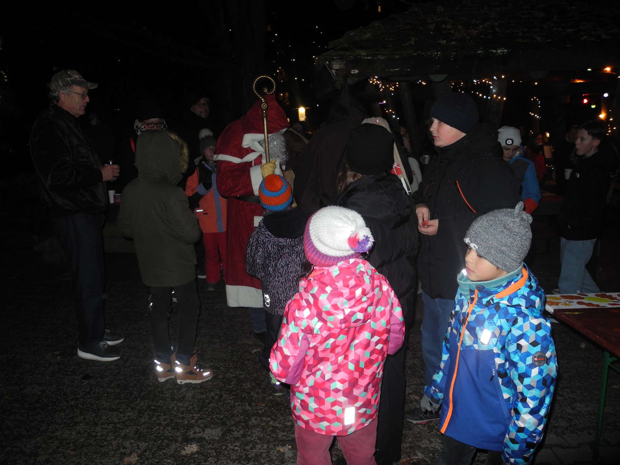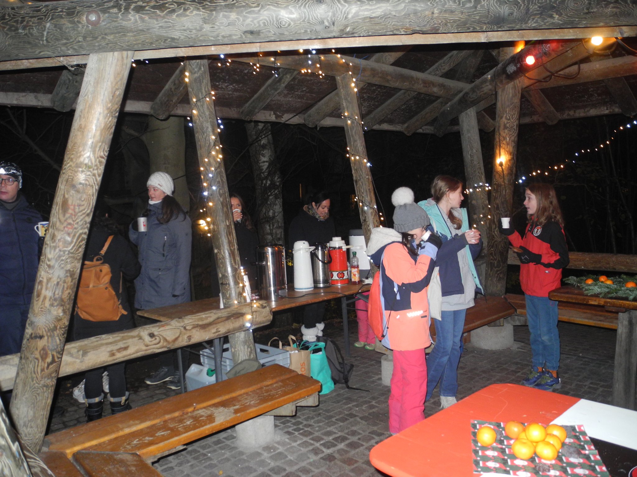 Schon von Weitem schimmern die Lichter und knistert das Feuer. Wunderschön gedeckte Tische mit Nüssen, Mandarinen und Weihnachtsguetzlis warten auf die Schar. Heisser Glühwein und süsser Punsch werden von den fleissigen Weihnachtselfen ausgeschenkt und bei dieser schönen Stimmung wird rege ausgetauscht und die Kinder haben alle Sinne auf Obacht, ob Sie nicht vielleicht schon ein Klingeln vernehmen...