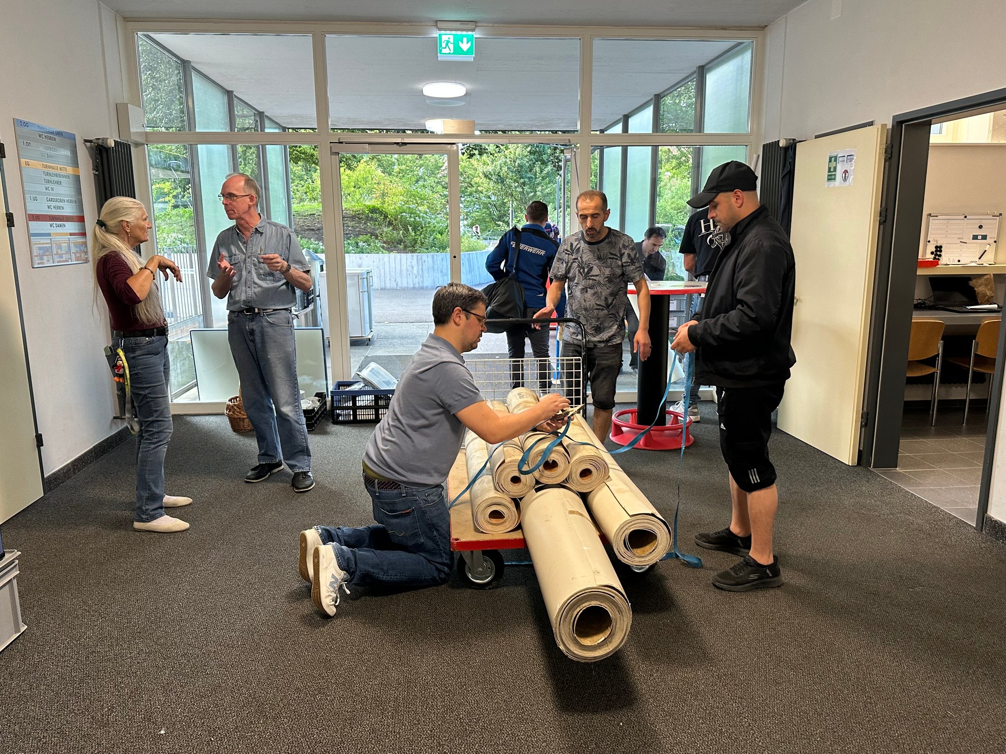 Um 8.00 Uhr war die Spannung der grossen Erwartung in der Luft förmlich mit Händen zu greifen, als die eifrigen Helfer die steilen Stufen erklommen. Sie waren schwer beladen mit Fechtpisten, Meldern, Bänken und Tischen sowie allen anderen Materialien, die man für ein Fechtturnier (inklusive Spaghettiplausch) braucht.