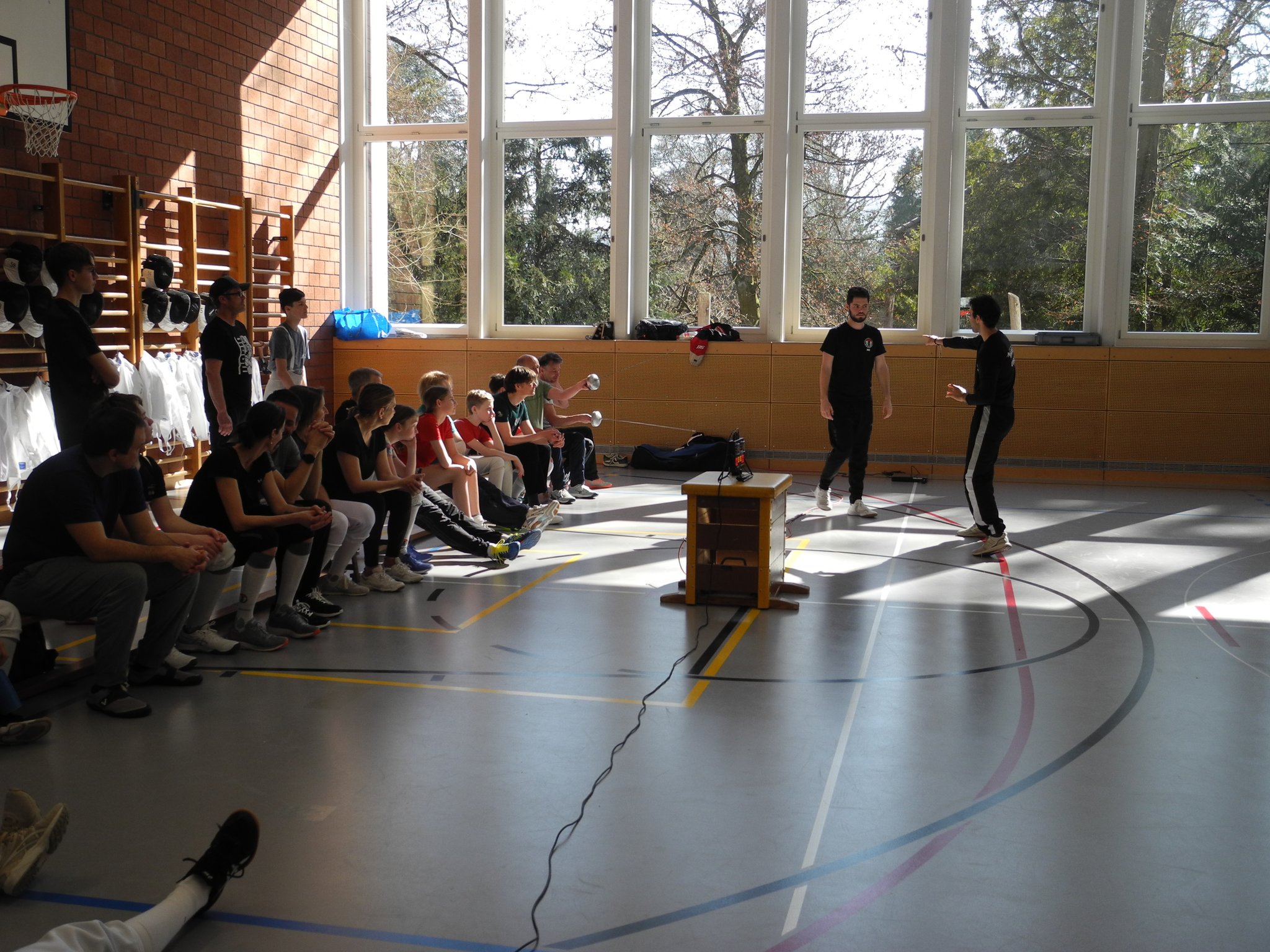 Die jungen Fechter verwandeln sich ganz selbstverständlich in Trainer und nach einer spannenden Einführung und einem dynamischen Einwärmen von Neil und Ehsan, geht es auch schon los.