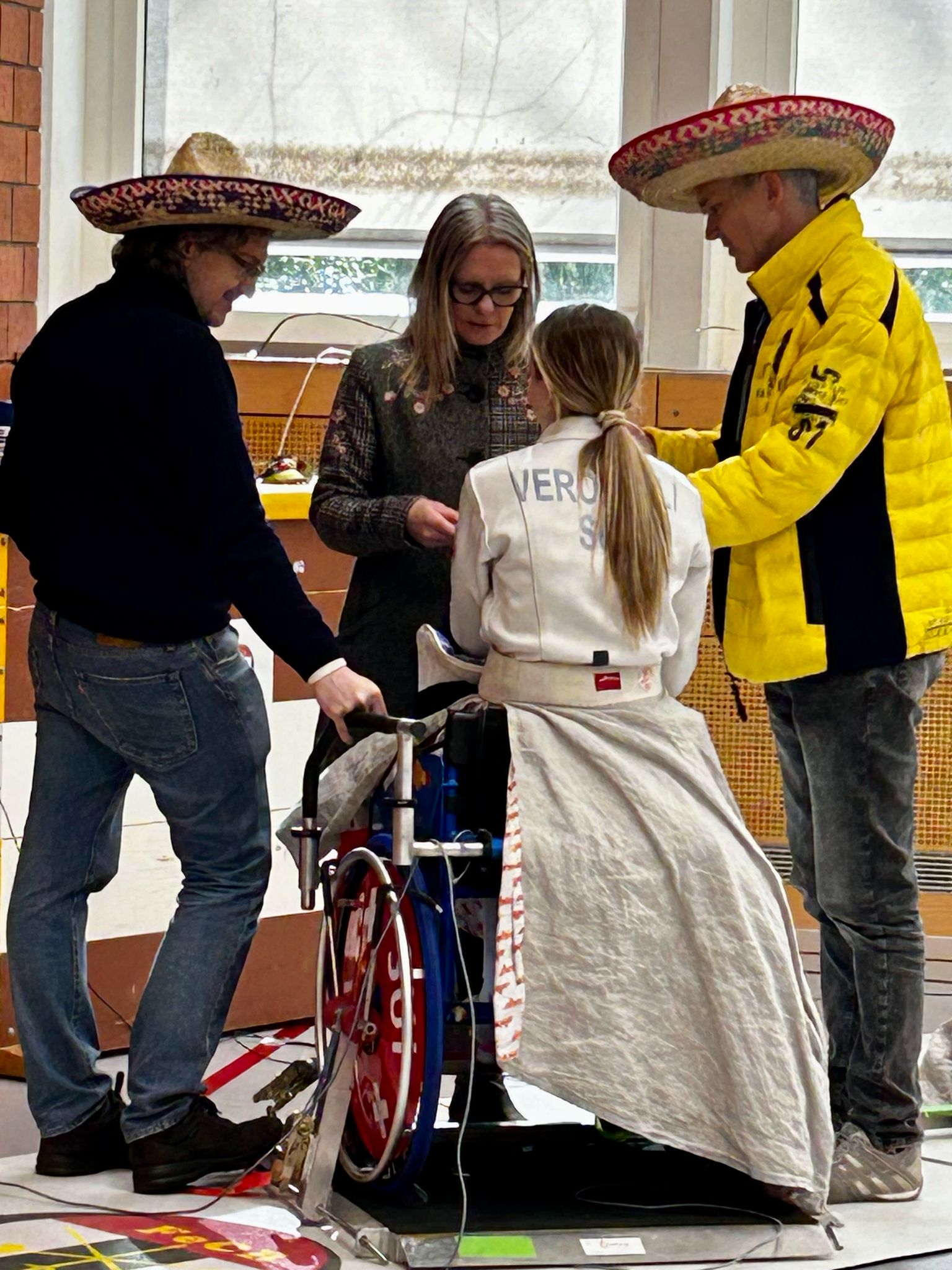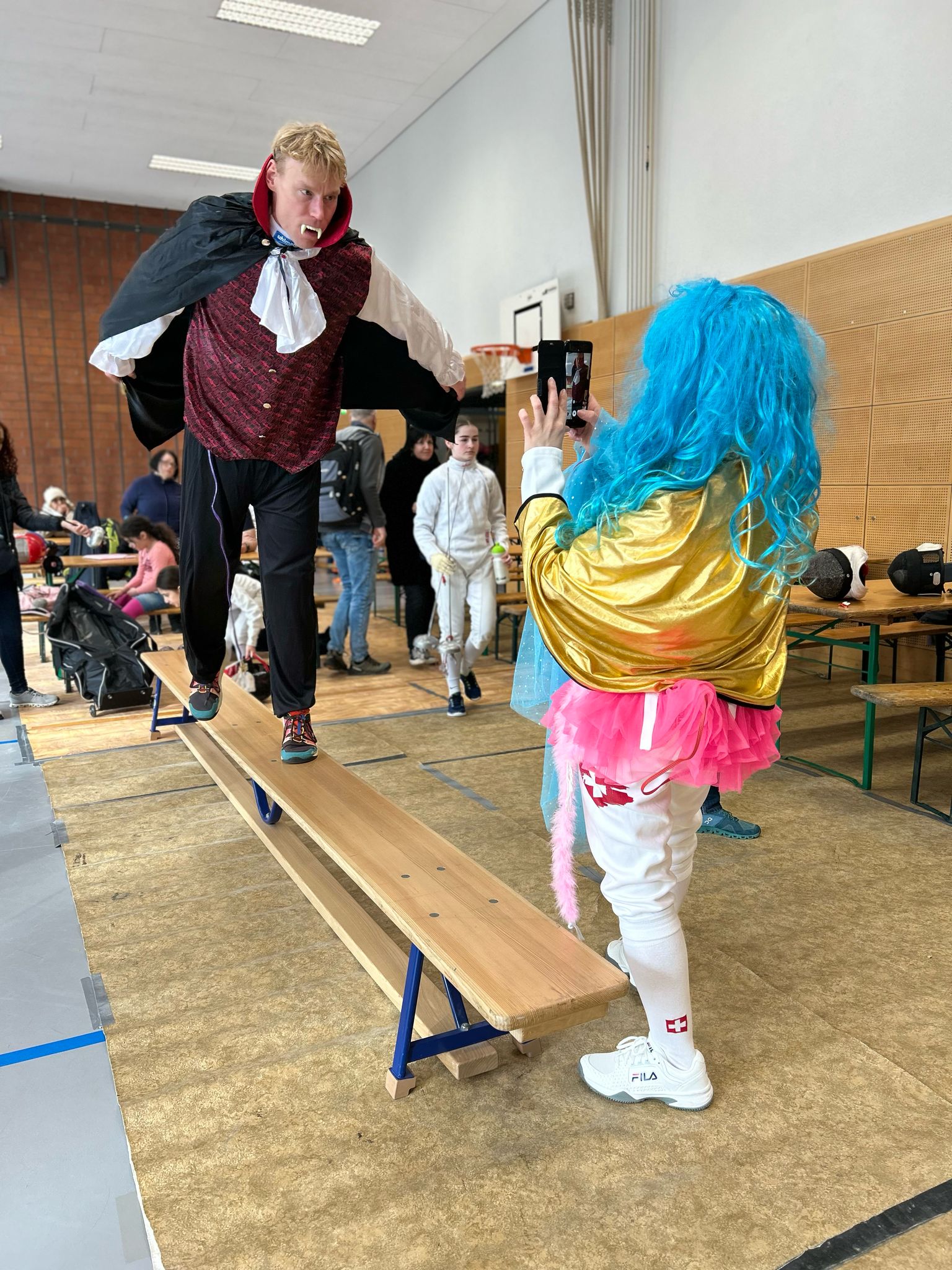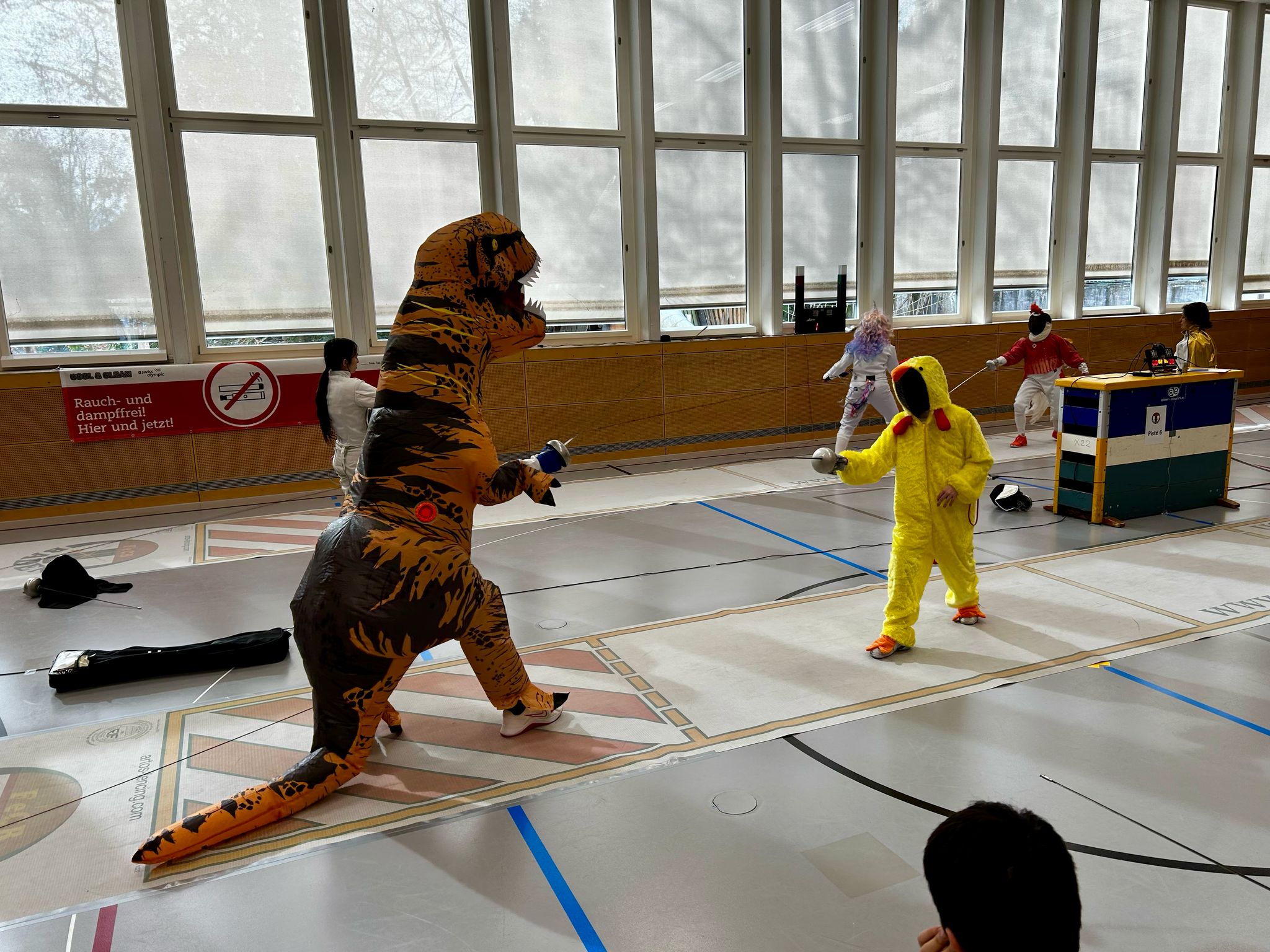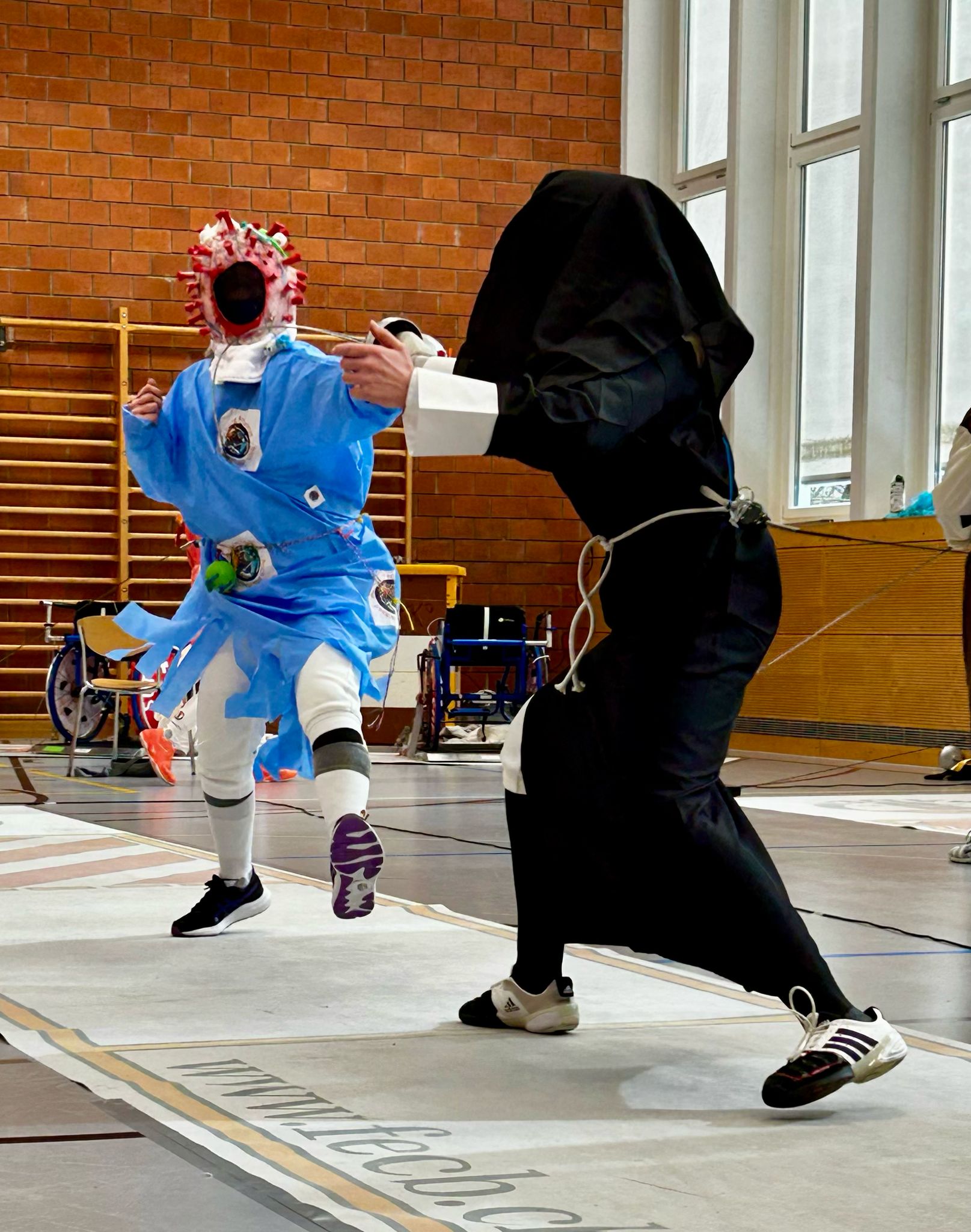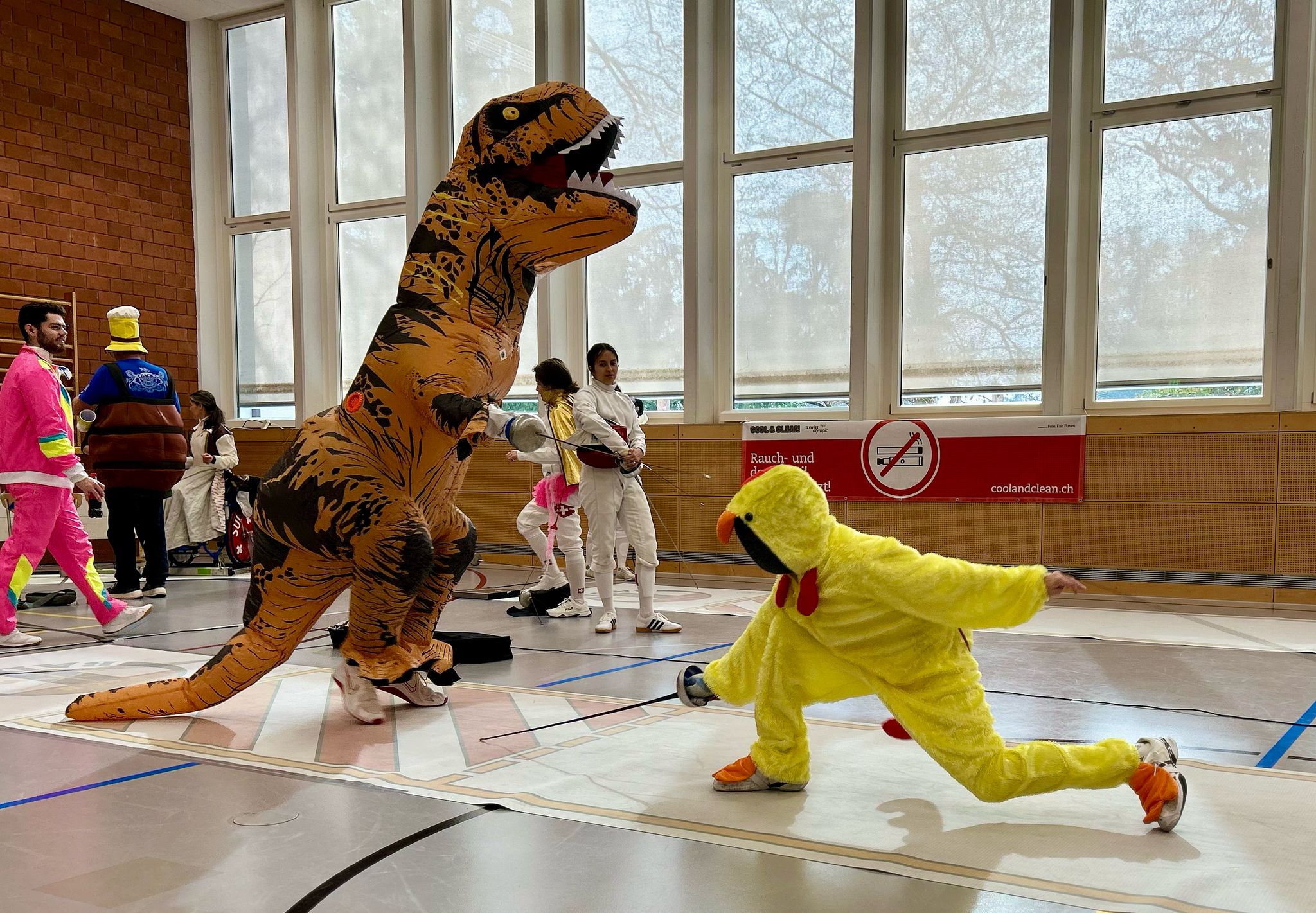 Als die „Fechtfasnächtler“ eintrafen, wurde schnell klar, dass der Kreativität in diesem Jahr keine Grenzen gesetzt waren. Graf Dracula, eine Nonne, Harry Potter, Clowns und viele weitere fantasievolle Gestalten nahmen am Turnier teil. Doch der aufregendste Moment kam, als ein echter Dinosaurier die Halle betrat – ein junger Teilnehmer, als Küken verkleidet, suchte panisch das Weite! Glücklicherweise hatte sich das prähistorische Wesen bereits gestärkt. Zwei Corona-Viren sorgten für zusätzlichen Spass, indem sie selbstgemachte Antivirenmittel in Form von erfrischenden Zitronen-Shots und süssen Leckereien unter den Anwesenden verteilten.